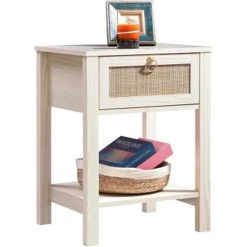 Boho Rattan Nightstand with Drawer & Shelf – Bedside End Table with Brass Knobs