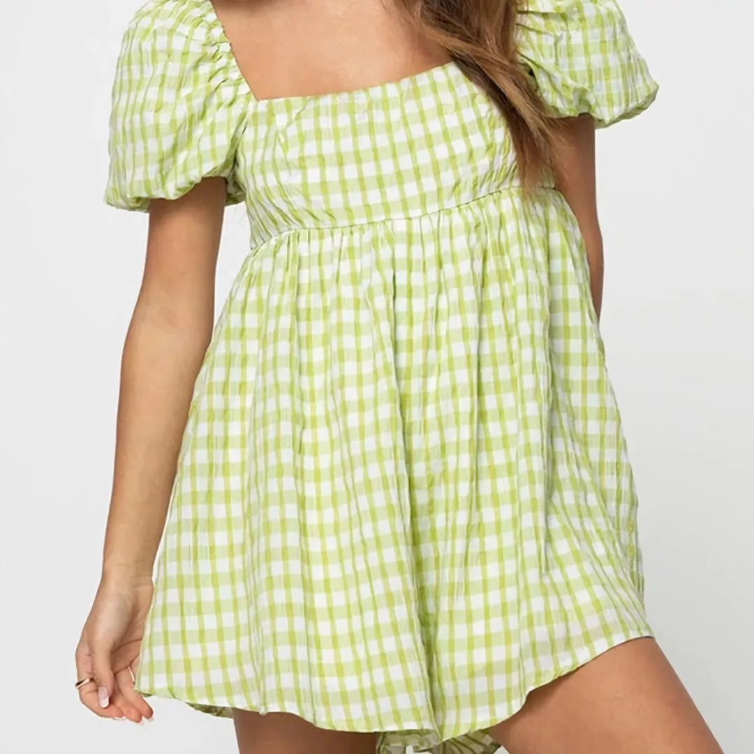 Chic Puff Sleeve Plaid Jumpsuit Dress for Women