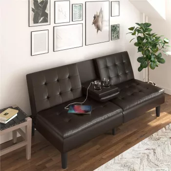 Modern Dark Brown Faux Leather Sofa with Cupholder & USB Charging
